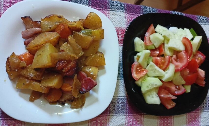 View More Gebackene Frühkartoffeln mit Bacon (oder vegan)Blumenkohl- und Spinatsalat
